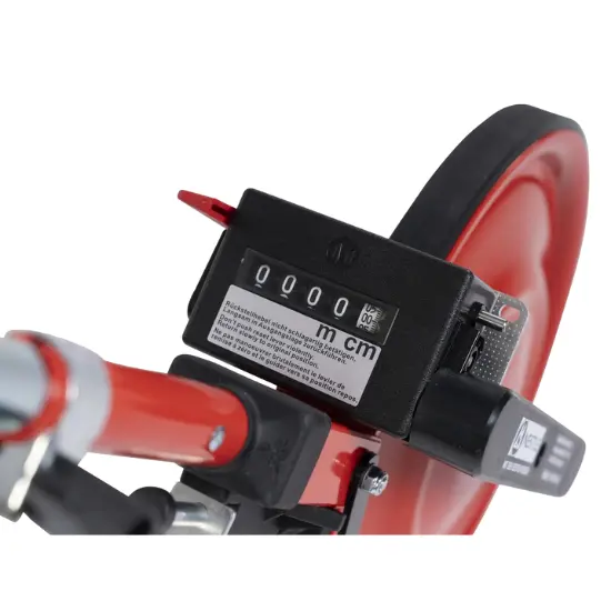De geijkte uitvoering beschikt over een analoge meter met een meetbereik tot 9999,99 cm. Bij terugrollen telt de meter automatisch terug, wat correcties eenvoudig maakt tijdens het meten. Dit meetwiel is geschikt voor professioneel gebruik waar nauwkeurigheid en duurzaamheid vereist zijn.